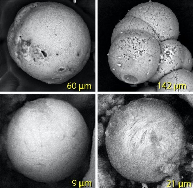 La capa de destrucción también contiene bolas de material derretido más pequeñas que las partículas de polvo en el aire. Llamadas esférulas, están hechas de hierro vaporizado y arena que se derritió a aproximadamente 1.590°C.