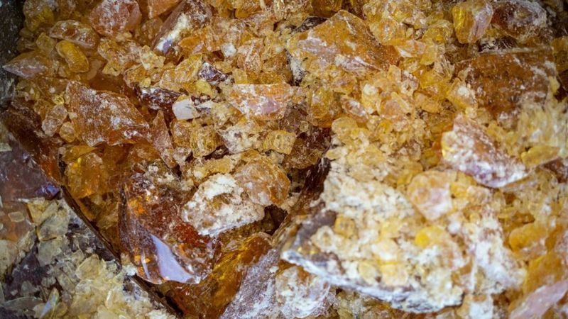 Los productores envían la sustancia a las fábricas destiladoras, que extraen la trementina de la resina que tiene una apariencia viscosa y amarillenta que se solidifica cuando se enfría y se convierte en piedras brillantes de color ámbar.