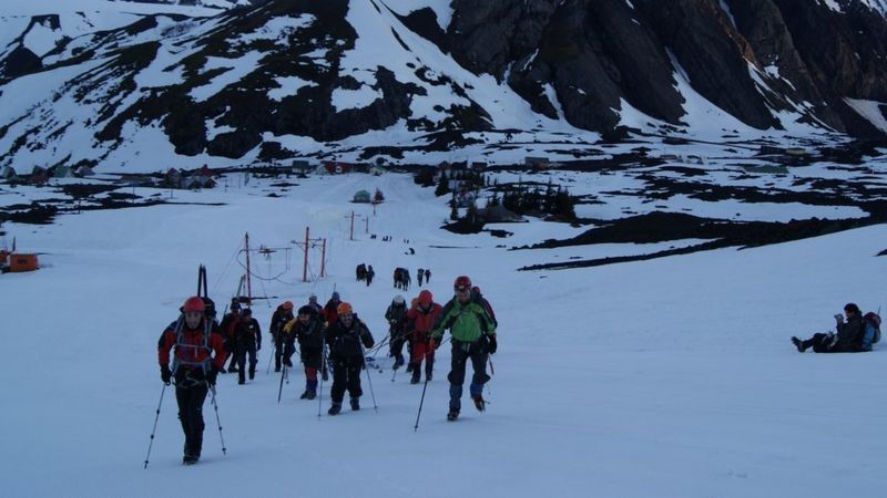 Para subir el volcán habían cuatro equipos: los perros, que eran los que arrastraban esta silla donde yo iba; los portadores, que llevaban la carga; una cuadrilla de rescate de bomberos; y el campamento base.