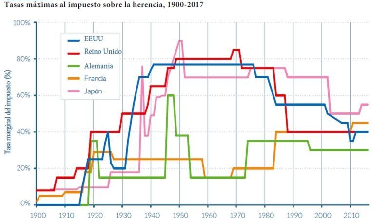Ahí aparecieron un compendio de cifras como la tasa máxima del impuesto sobre los ingresos de los más ricos de EE. UU (del 91% al 37%), o la de Reino Unido (que desde cotas similares pasó a menos de un 50%) u otros países europeos y asiáticos con caídas de alrededor de 10 y 15 puntos, que serían incluso mayores de retroceder más en el tiempo hasta sus máximos históricos.