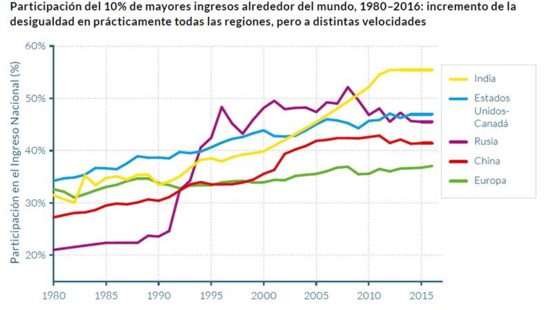 Entre 1980 y 20015, el 1% más rico del mundo recibió una proporción dos veces mayor del crecimiento económico que el 50% de la población con menores ingresos, según el Informe de desigualdad global del WID, coordinado por el economista francés Thomas Piketty, entre otros.