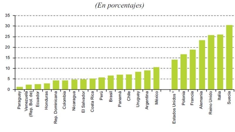 Tasa del impuesto sobre la renta que realmente paga el 10% más rico de la población en países latinoamericanos, comparado con la misma tasa efectiva de otros países.