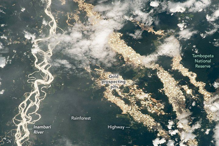 Según explicó la agencia espacial estadounidense, los "ríos de oro" capturados en las imágenes muestran los pozos que excavados para la minería ilegal, que aparecen como cientos de cuencas llenas de agua, donde se ha eliminado la vegetación, rodeadas de barro .