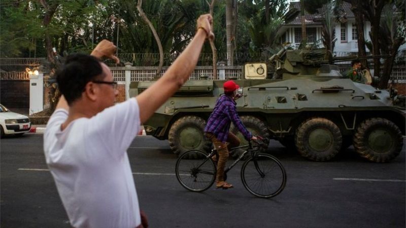 En Rangún, la ciudad más grande del país, por primera vez desde el golpe se ven vehículos blindados recorriendo las calles. Monjes y obreros encabezaron una manifestación, mientras que grupos de motociclistas se movilizaron por las calles de la capital, Naipyidó.