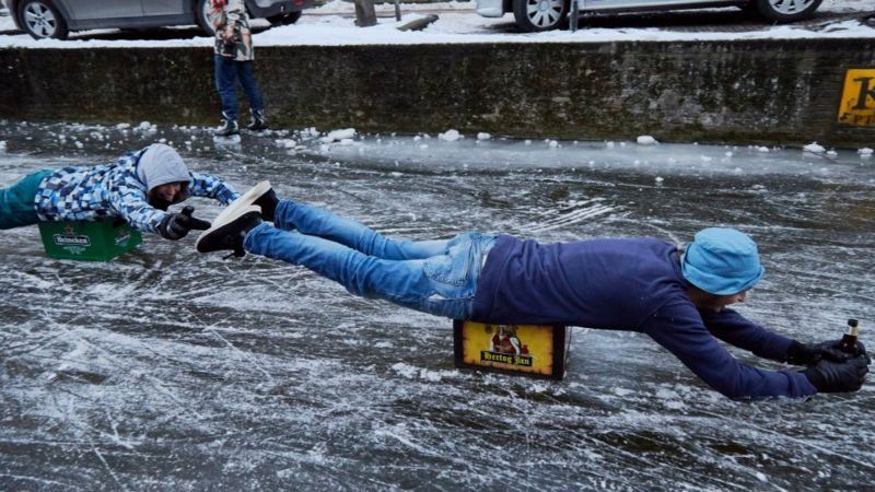 En Países Bajos, muchos han usado sus famosos canales para patinar y jugar sobre el agua congelada.