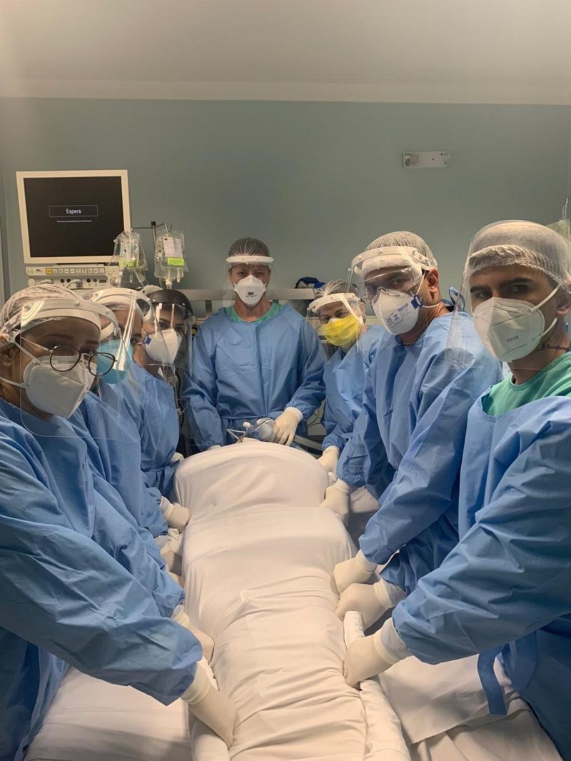 La indignación generó el deseo de compartir las fotos más impactantes durante el período que estuvo internada en la UCI: la que está boca abajo y la que muestra al equipo médico preparándose para dejarla en decúbito prono.