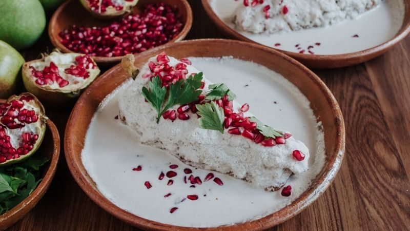 Los chiles en nogada están cubiertos de una salsa de crema de nuez con perejil y semillas de granada.