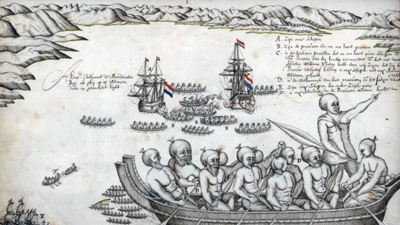 Su primer encuentro con los maoríes locales no fue bien: el segundo día, varios remaron en una canoa y embistieron un pequeño bote que pasaba mensajes entre los barcos holandeses. Murieron cuatro europeos.