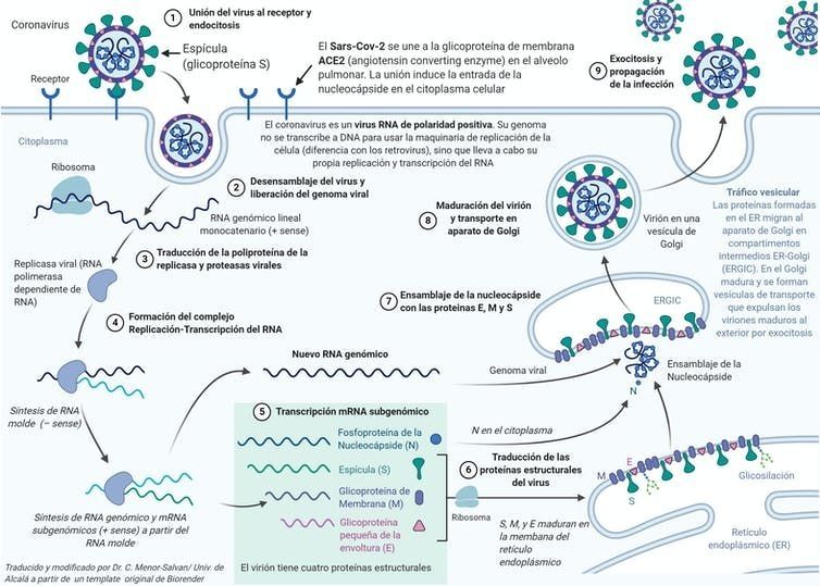 Cuando el coronavirus infecta, la célula se convierte en una fábrica de copias de sus componentes, a partir de la información contenida en el ARN genómico.
