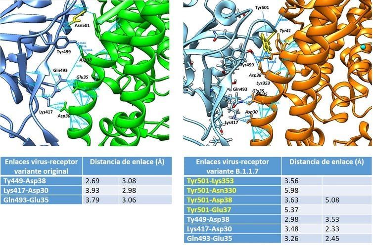 Con ayuda de una herramienta informática, vemos que la mutación provoca la aparición de nuevos enlaces entre el virus y la célula. Esto hace que aumente la afinidad y la infectividad.