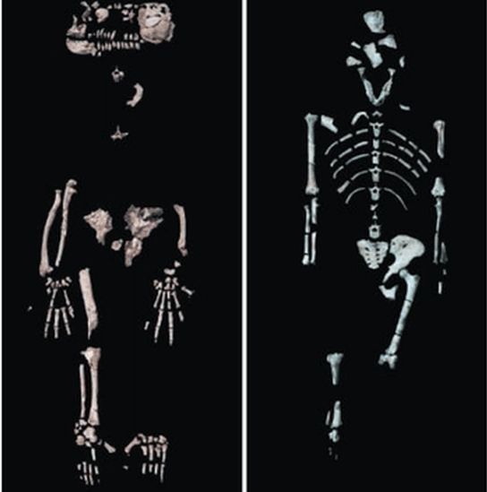 Al reconstruirlo, vieron que las piezas conformaban aproximadamente el 40% del esqueleto (o el 70% después de que los técnicos de laboratorio crearan réplicas de huesos que faltaban en el lado opuesto) de una mujer pequeña con un cerebro del tamaño de un simio, quien medía poco más de un metro de altura.