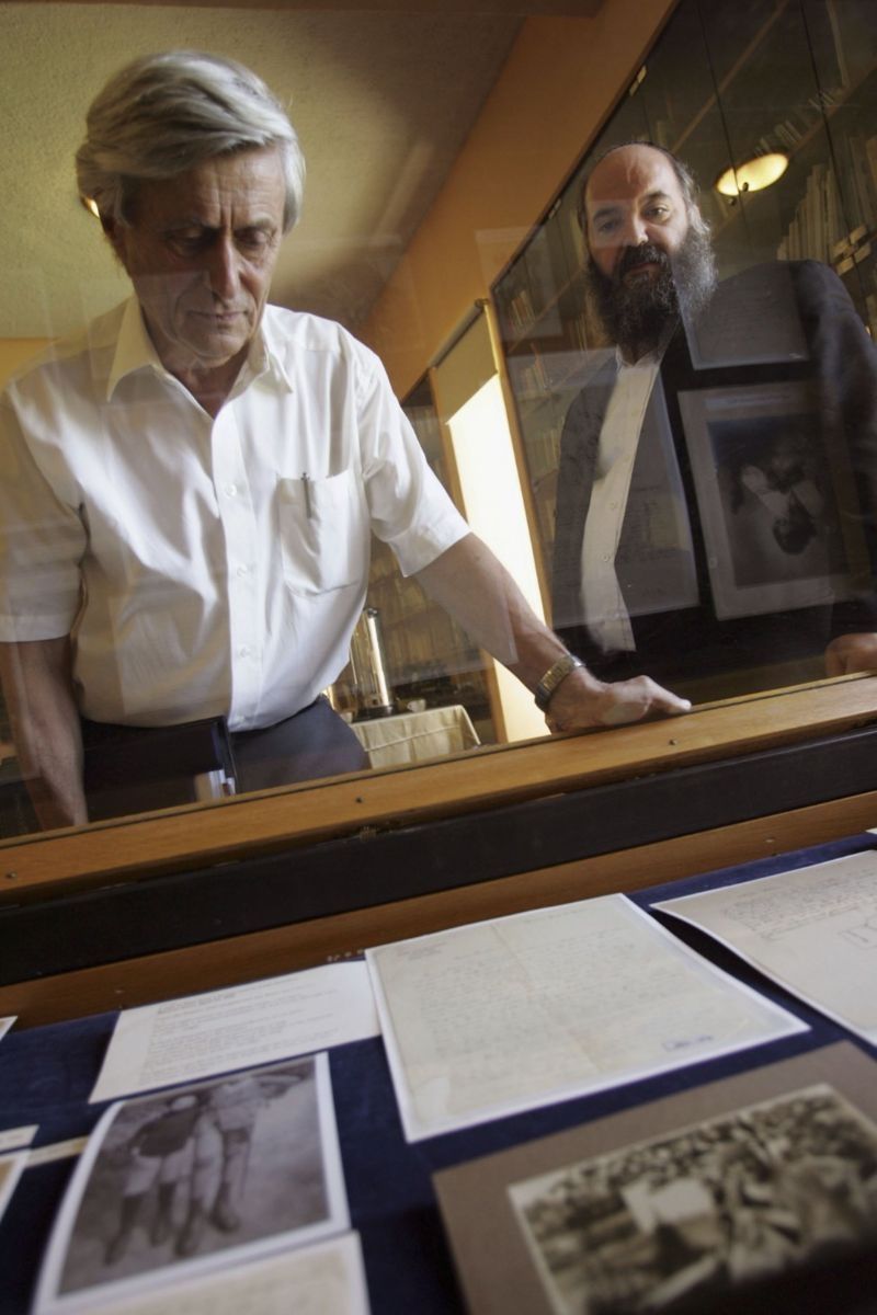 Tras ofrecer una rueda de prensa en 2006, el profesor emérito de la Universidad Hebrea Hanoch Gutfreund (izquierda) observa parte del archivo de Einstein, en una exposición que él ayudó a organizar en esa institución.