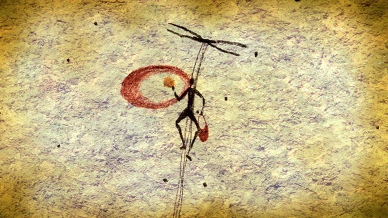 Un pintura rupestre en España que se interpreta como una persona escalando un peñasco con cuerdas para recolectar miel de una colmena de abejas. Es posible que esté usando el humo de una tea para ahuyentar las abejas.