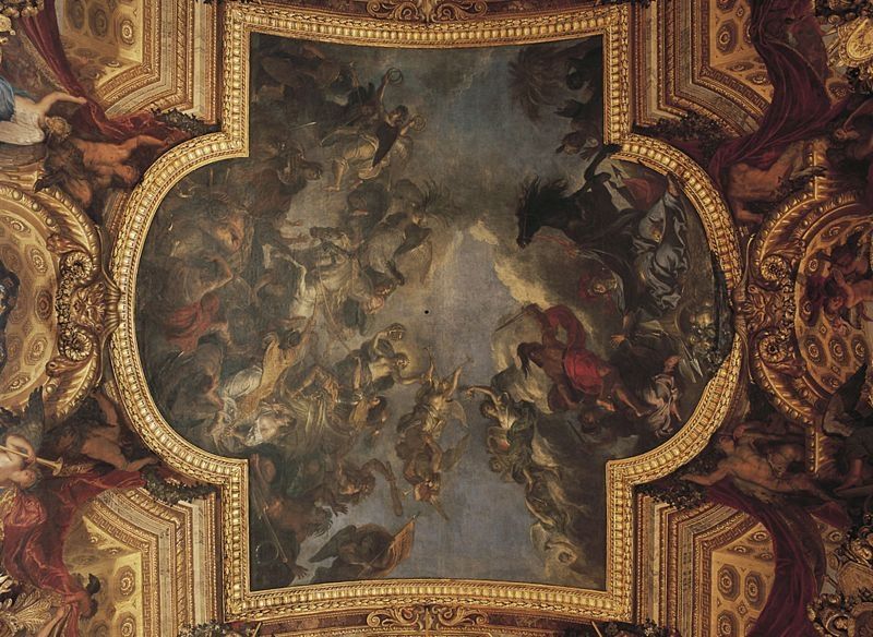 Aún más simbólicamente apreciado fue escoger para la ocasión el célebre Salón de los Espejos, con pinturas de Charles Le Brun en sus techos abovedados ensalzando victorias pasadas, como la de Luis XIV sobre el Rin.