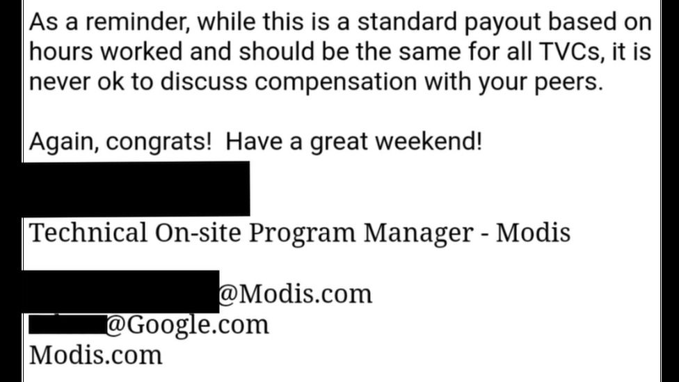Shannon dice que incluso recibió un mensaje de un jefe que decía: "Nunca está bien hablar de la compensación con tus colegas". Se lo enseñó a la BBC: