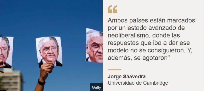 "Ambos países están marcados por un estado avanzado de neoliberalismo, donde las respuestas que iba a dar ese modelo no se consiguieron. Y, además, se agotaron", le dice a BBC Mundo Jorge Saavedra, académico de la Universidad de Cambridge y experto en temas de América Latina.