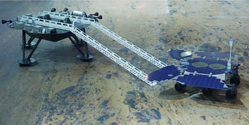 Este modelo muestra cómo Zhurong descenderá desde su plataforma de aterrizaje.