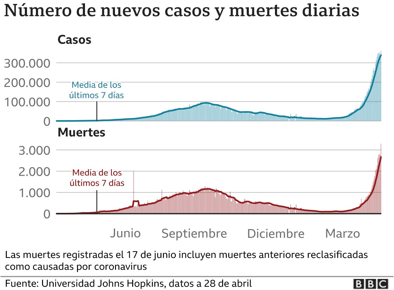 En India, llevan más de 10 días apareciendo imágenes perturbadoras de familias mendigando camas de hospital y suministros vitales, mientras que las morgues y los crematorios siguen desbordados.