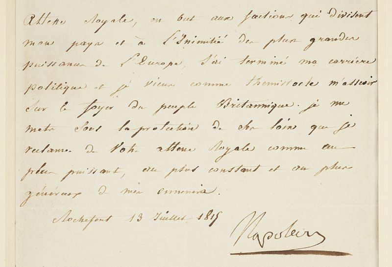 Firmada por el propio emperador, la carta aboga por la "hospitalidad del pueblo británico" y le hace un llamado al príncipe -"el más poderoso, el más constante y el más generoso de mis enemigos"- para que lo proteja. Buscando refugio, el emperador se compara con Temístocles, un estadista griego que se puso a las órdenes del gobernante persa Artajerjes y posteriormente fue recibido con honores.