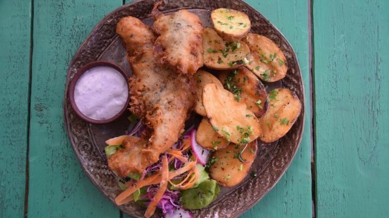El chef mapuche José Luis Calfucur sirve en Amaia pescado frito con papas nativas, aderezadas con una salsa a base de maqui.