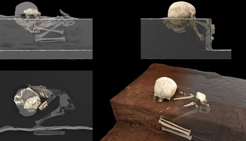 Los científicos pudieron estudiar la dentadura para confirmar que se trataba del pequeño cuerpo de un menor humano -de entre 2 y 3 años de edad. Escaneos revelaron que el cuerpo había sido colocado en una posición fetal.