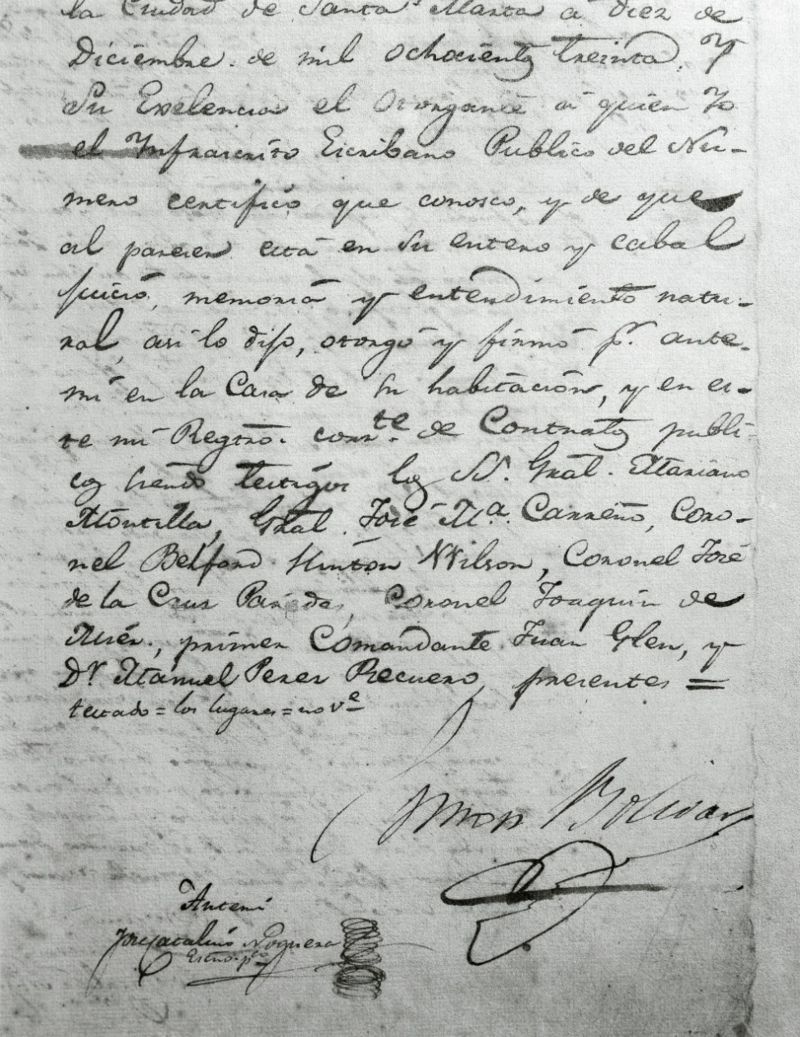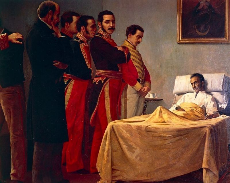 "Piensa marchar a Europa, pero la muerte le sorprende en San Pedro Alejandrino, una hacienda situada en las cercanías de Santa Marta, el 17 de diciembre de 1830".