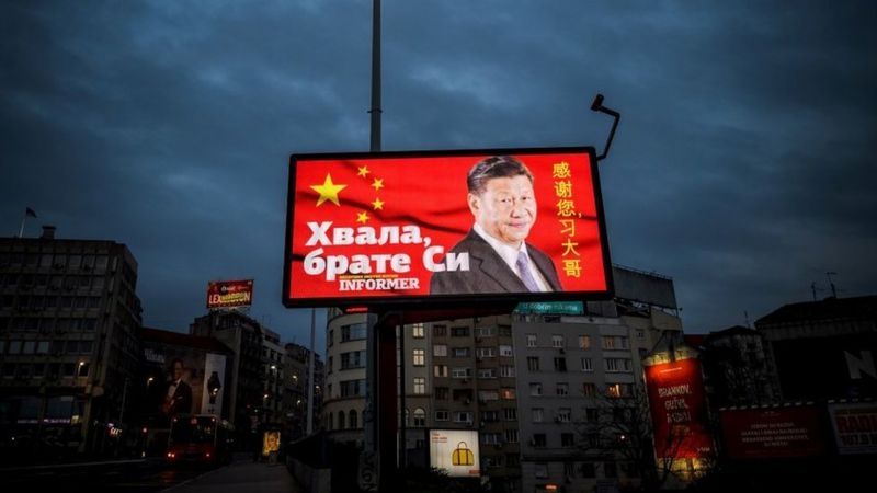Una foto de marzo de 2020 de una valla publicitaria con la cara del presidente chino Xi Jinping y las palabras "Gracias hermano Xi", en un concurrido bulevar de Belgrado, Serbia.