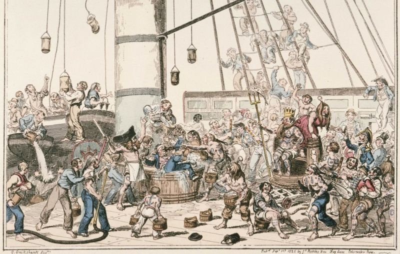 Commerson describe la inusualmente brutal ceremonia como "una mascarada de demonios", aunque, siendo un caballero, su 'bautismo' no fue más que un baño con un balde de agua. Los marineros ordinarios se desnudaron para sumergirse en un estanque fétido y fueron golpeados con remos por los "acólitos de Neptuno" y pintados de verde.