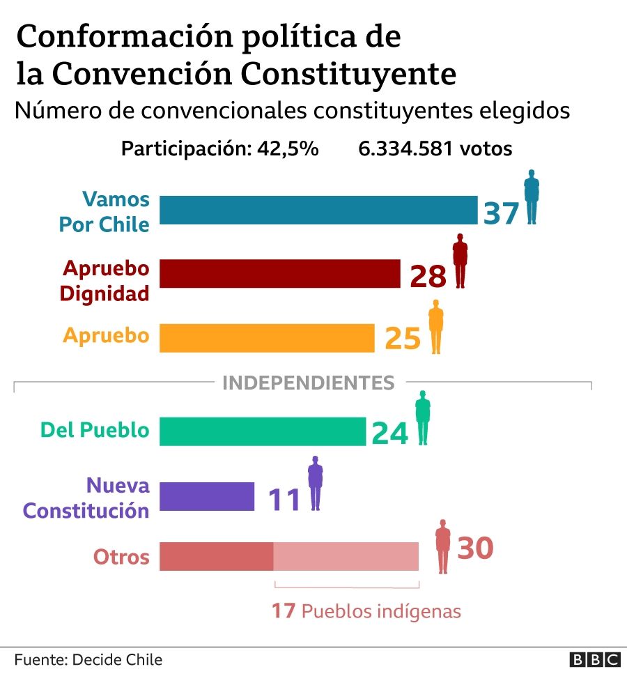 En cambio, los partidos tradicionales fueron fuertemente castigados: la derecha consiguió solo 37 puestos (lo que la deja lejos del tercio necesario para influir en el contenido de la nueva carta magna) mientras que la centroizquierda (que gobernó el país entre 1990 y 2010) fue superada por el Partido Comunista y el Frente Amplio.