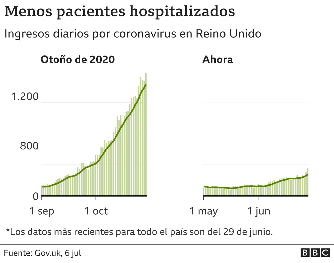Aunque actualmente el número de casos es elevado, las muertes se han mantenido en un nivel relativamente bajo, lo cual sugiere que el avanzado programa de vacunación de Reino Unido ha hecho que el virus sea menos mortal.