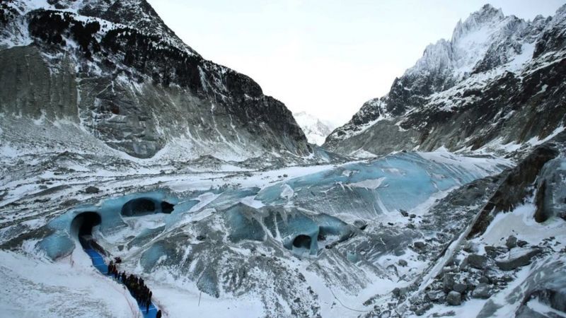 Las cuevas de hielo formadas en los glaciares del Mont Blanc por el agua de deshielo son lo suficientemente grandes como para atravesarlas.