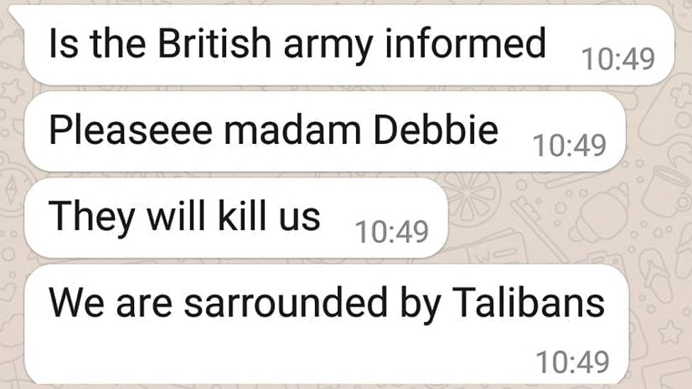 "Debbie, por favor, ayúdanos, señora, señora, por favor, ayuda. Queremos ir a hablar con los funcionarios británicos. Simplemente avise al ejército estadounidense para que nos deje pasar, los talibanes están aquí, por favor, estoy en el baño. Por favor, señora, ¡por favor!".