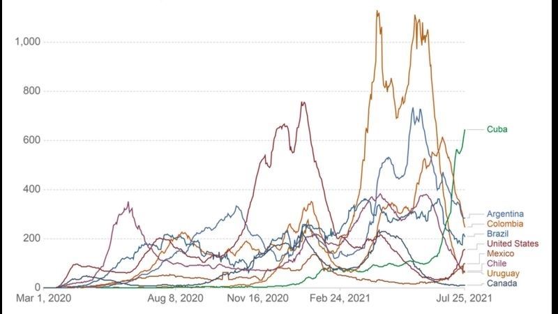 Aunque logró mantener el coronavirus contenido durante gran parte de 2020, Cuba es actualmente el lugar con el más alto número de contagios por nivel de población de todo el continente y uno de los primeros del mundo.