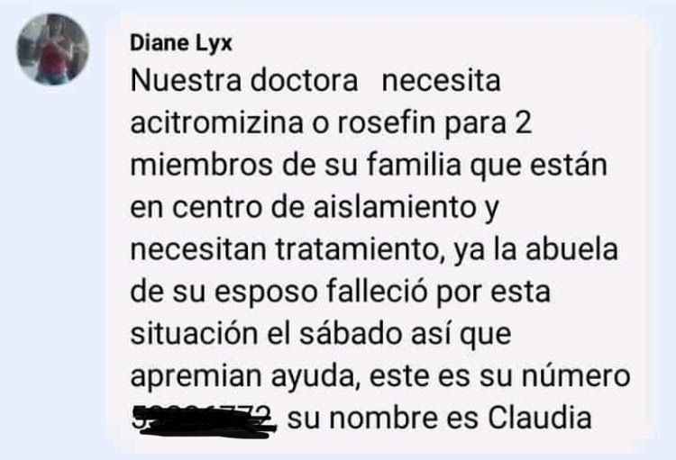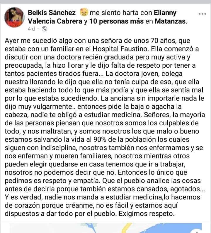 "La mayoría de las personas piensan que nosotros somos los culpables de todo y nos maltratan y somos nosotros los que, malo o bueno, estamos salvando la vida al 90% de la población", escribió una doctora en una publicación de Facebook.
