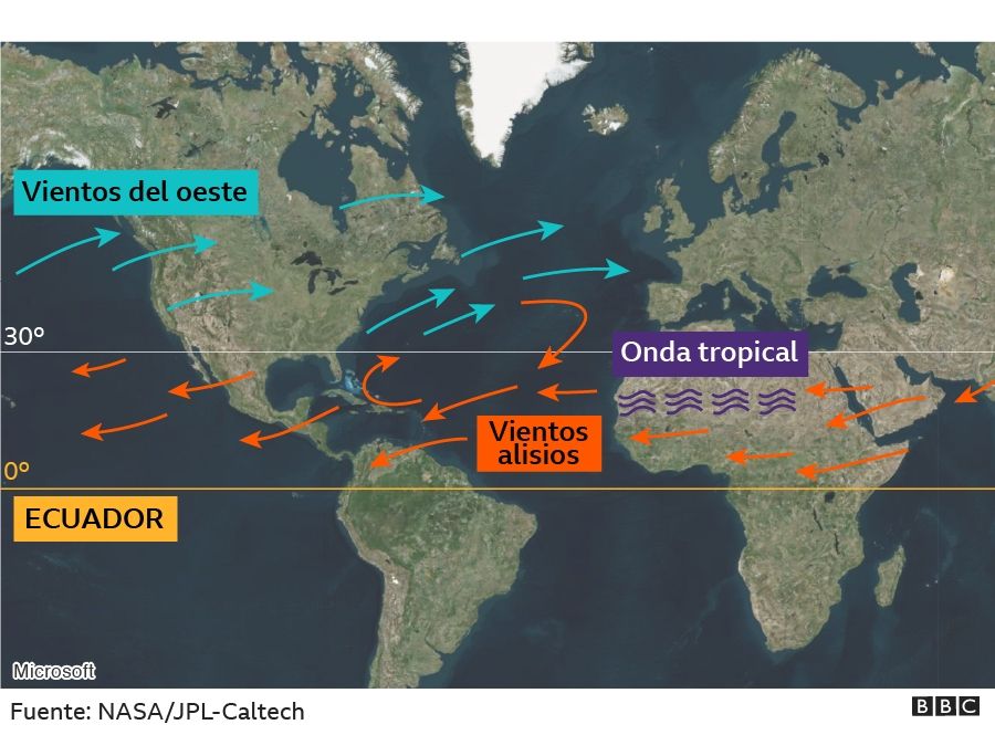 Los vientos alisios — las corrientes de vientos globales en el trópico — van de este a oeste llevándolos hacia las costas del Caribe, el Golfo de México y el sur de Estados Unidos.