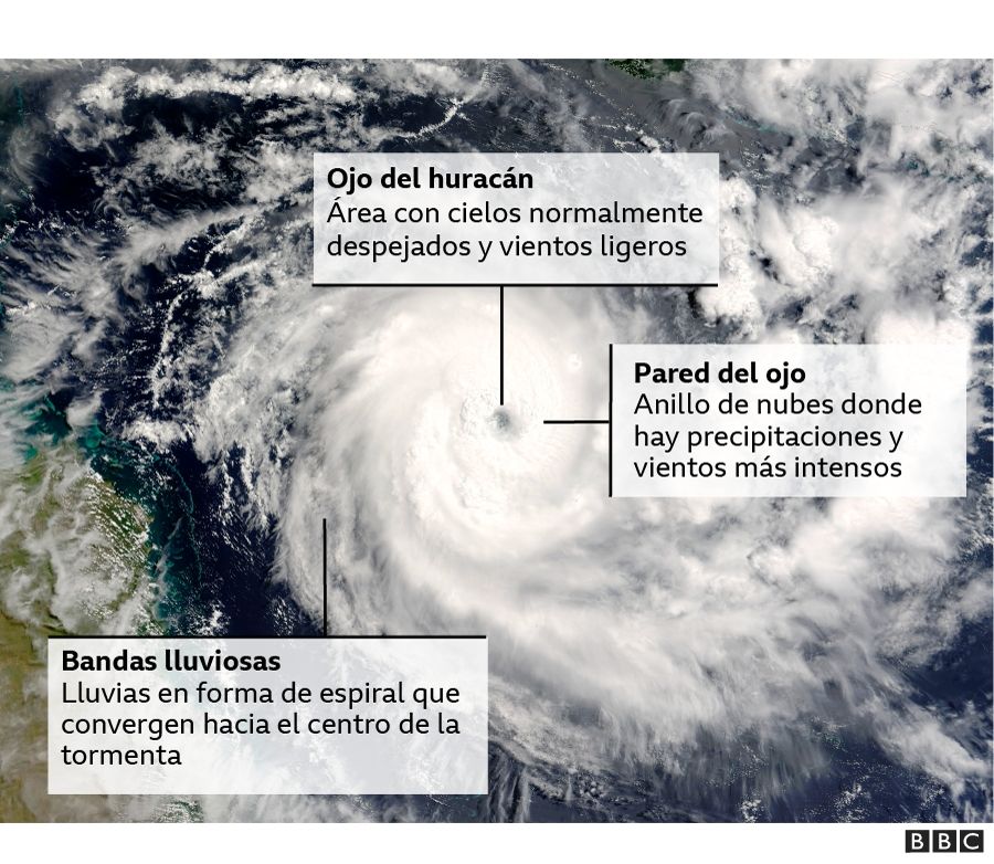 Más allá, están las bandas nubosas en forma de espiral, donde hay más lluvias.