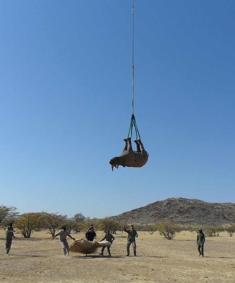 Este tipo de transporte aéreo es usado con cada vez más frecuencia para trasladar rinocerontes entre zonas de hábitat fragmentado.