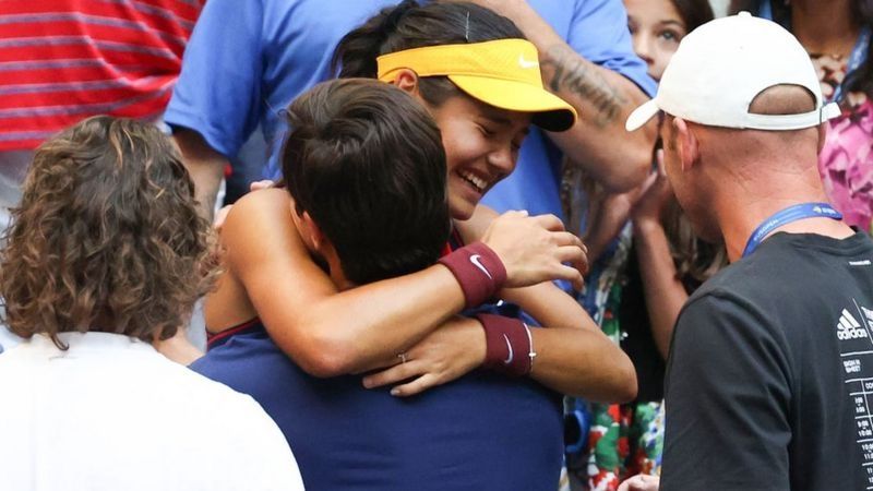 Las dos deportistas compartieron un cálido abrazo antes de que Raducanu subiera las escaleras del estadio Arthur Ashe para celebrar con su palco de apoyo.