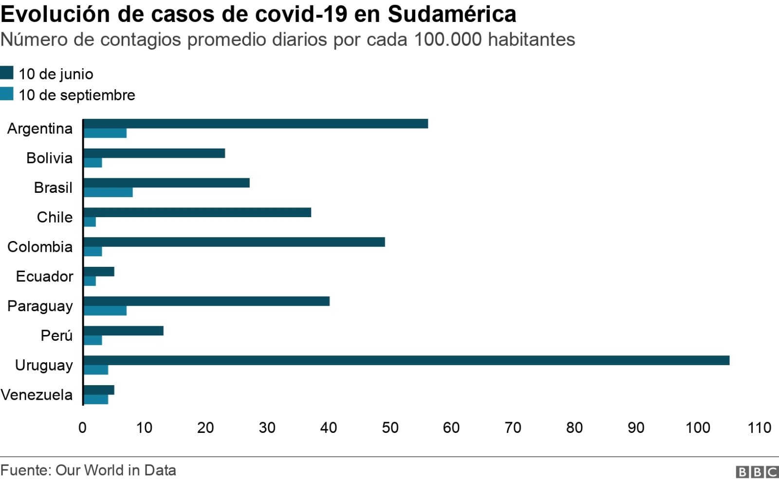 Países como Uruguay, que a inicios de junio llegó a tener 100 casos por cada 100.000 habitantes, ahora solamente tienen 4; mientras que Paraguay que registró hasta 40 casos ahora no llega ni a 1 por cada 100.000 habitantes.