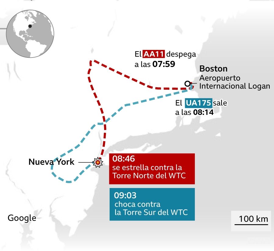 El primer avión chocó contra la torre norte a las 8:45 de la mañana. El edificio ardió durante 102 minutos y luego, a las 10:28 a.m. se derrumbó en solo 11 segundos.
