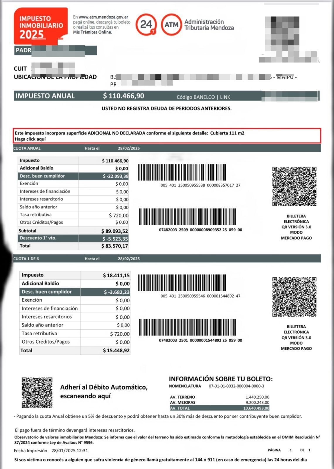 María es docente y propietaria de una vivienda del Instituto Provincial de la Vivienda (IPV) en Maipú. En 2024, pagaba un impuesto inmobiliario de $12.000 anuales. Sin embargo, en 2025 recibió una boleta con un incremento descomunal: $110.466,90, es decir, un aumento de más del 800% en solo un año.