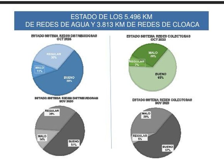 Aysam afirma administrar 5.496 km de redes de agua y 3.813 km de cloacas, pero no existe un inventario público, auditable y actualizado. Lo único que se conoce son gráficos de torta presentados en audiencias públicas, donde se informa, con vaguedad, que entre el 11% y el 39% del sistema estaría en mal estado. No hay cronograma de obras. No hay sistema de información accesible. No hay evaluación técnica externa.