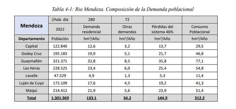 Aún más grave: el único diagnóstico serio disponible proviene de un informe externo, el Plan Maestro Hídrico del Departamento General de Irrigación. Allí se calcula que el 46% del agua potable se pierde en la red. Y el dato más escandaloso: en Guaymallén se pierden anualmente 85,8 hm³ de agua, mientras que el consumo poblacional total es de 77,1 hm³. Es decir: se pierde más agua en las cañerías rotas que la que llega a la gente.