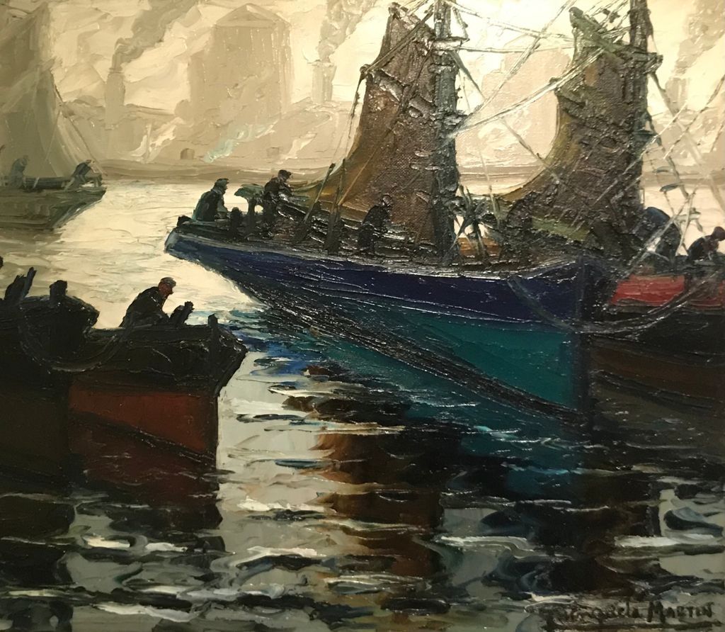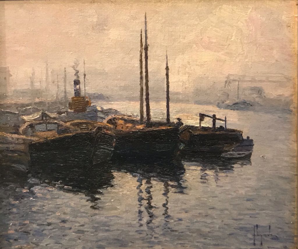 El MAMU expone de él “Mañana gris”, una vista del Riachuelo donde entre la niebla por detrás de los lanchones puede verse la silueta de las chimeneas y el transbordador Nicolás Avellaneda.