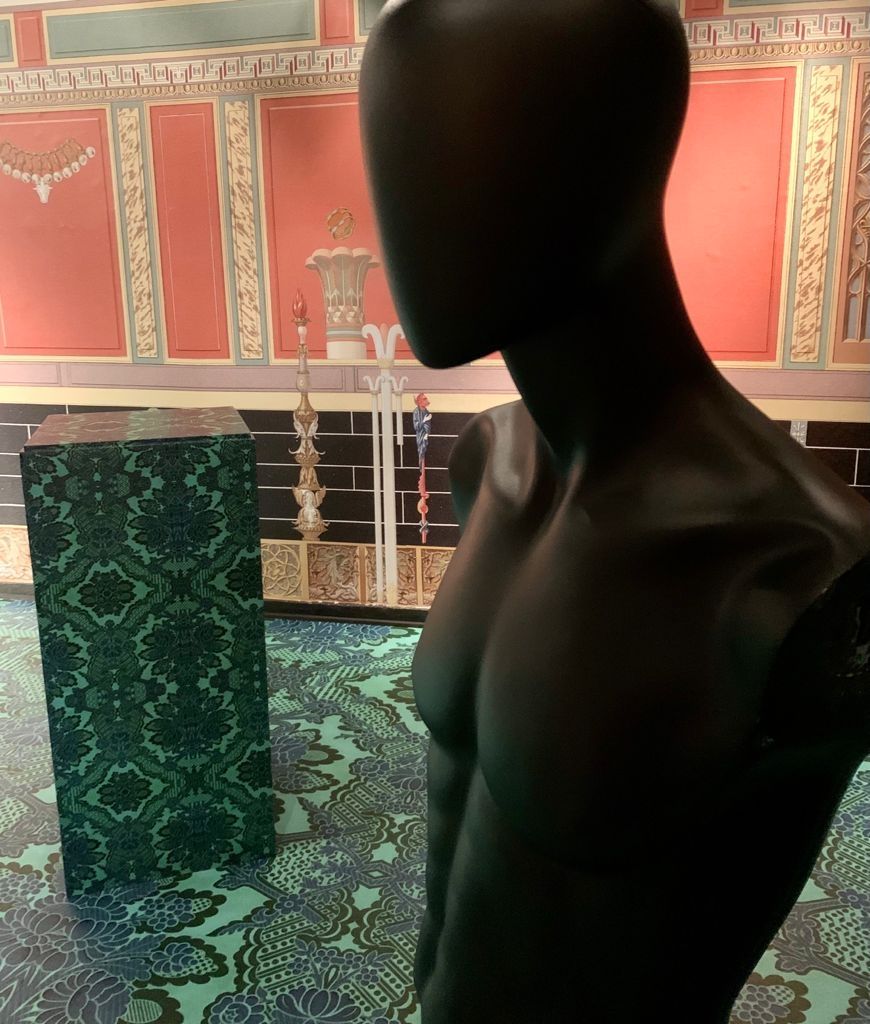 demostración de conocimiento y sofisticación, reflejo de su clase social de la época. La artista toma este mismo principio en una suerte de emulación cuyo resultado es la suma de elementos diversos que combinados resultan rozar el kitsch, y entran en un juego desbordante con objetos de la colección del Museo.