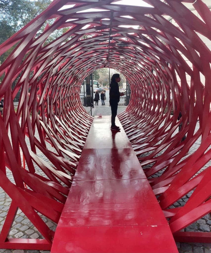 Luciana Lamothe (Argentina) con su escultura de tirantes de madera “Repetición por quiebre” (2021), en este caso como otros trabajos suyos se inspira en estructuras utilizadas en la construcción (andamios por ejemplo). Habrá que atravesar su obra pintada en rojo vivo que llevará al ingreso del Palacio Errázuriz Alvear. Una travesía que nos permitirá “espiar” hacia los costados. Túnel de ingreso con fuerte impacto visual. El contrapunto se establece entre la precariedad de esta estructura pasajera con la nobleza estilístico constructiva del MNDA.