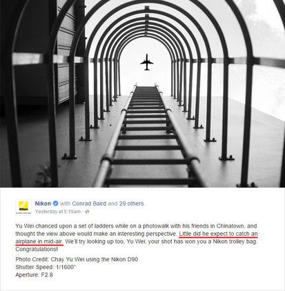 Nikon premió esta increíble imagen de un avión obra de Chay Yu Wei. Sin embargo, otros fotógrafos muy pronto descubrieron que se trataba de un fraude gracias a Photoshop.