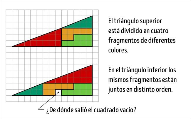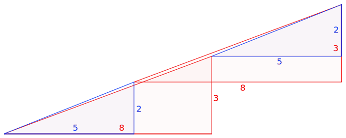 En realidad, no es una ilusión óptica sino una tarea interesante. Las superficies de ambas figuras coloreadas, por supuesto, son iguales (32 cuadrados). Sin embargo, lo que percibimos como triángulos 13×5, en realidad no lo son y tienen superficies diferentes (S 13×5 = 32,5 cuadrados). Es decir, el error disimulado en la condición del problema, consiste en que la figura inicial fue llamada triángulo (en realidad, es un cuadrilátero cóncavo). Esto se hace evidente en el esquema de abajo donde las «hiponetusas» de ambas figuras pasan por puntos diferentes: en la parte superior (8,3) y la parte inferior (5,2). El secreto está en las propiedades de los triángulos azul y rojo.Esto es fácil de comprobar con unos cálculos.