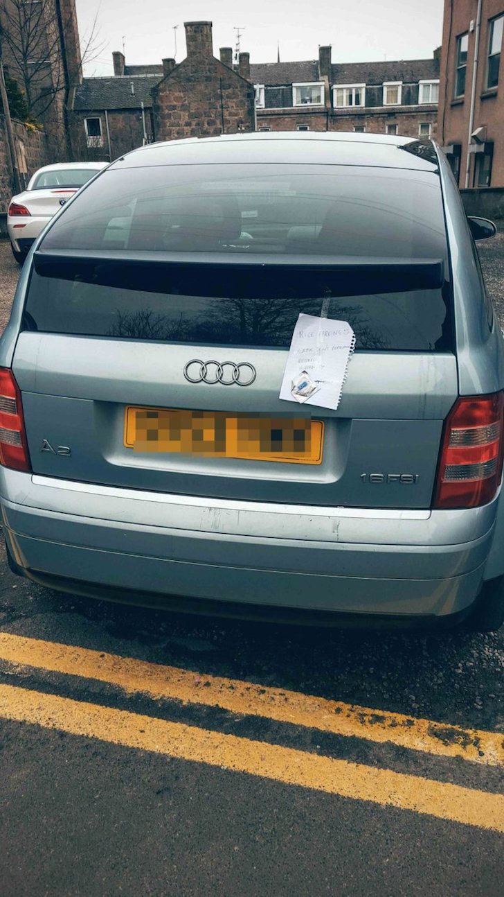 Una fotografía compartida en redes sociales muestra un Audi A2 plateado estacionado con suparachoques casi tocando las líneas amarillas dobles en algún lugar de Aberdeen, Escocia. También se observa el coche mal acomodado.