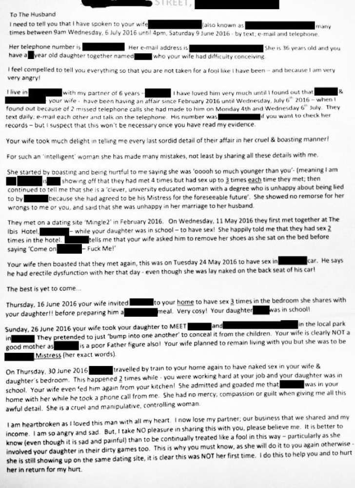 El resto de la carta cuenta detalles de la relación y de momentos en que el esposo de la mujer que escribió la carta y su amante se reunieron para tener relaciones sexuales. También revela que ambos se conocieron a través de una página de internet de citas.